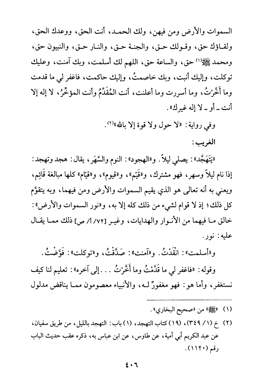 السموات والأرض ومن فيهن، ولك الحمد، أنت الحق، ووعدك الحق، ولقاؤك حق، وقولك حق، والجنة حق، والنار حق، والنبيون حق، ومحمد -صلى اللَّه عليه وسلم- (¬1) حق، والساعة حق، اللهم لك أسلمت، وبك آمنت، وعليك توكلت، وإليك أنبت، وبك خاصمتُ، وإليك حاكمت، فاغفر لي ما قدمت وما أَخَّرْتُ، وما أسررت وما أعلنت، أنت المُقَدِّمُ وأنت المؤخِّرُ، لا إله إلا أنت -أو- لا إله غيرك".