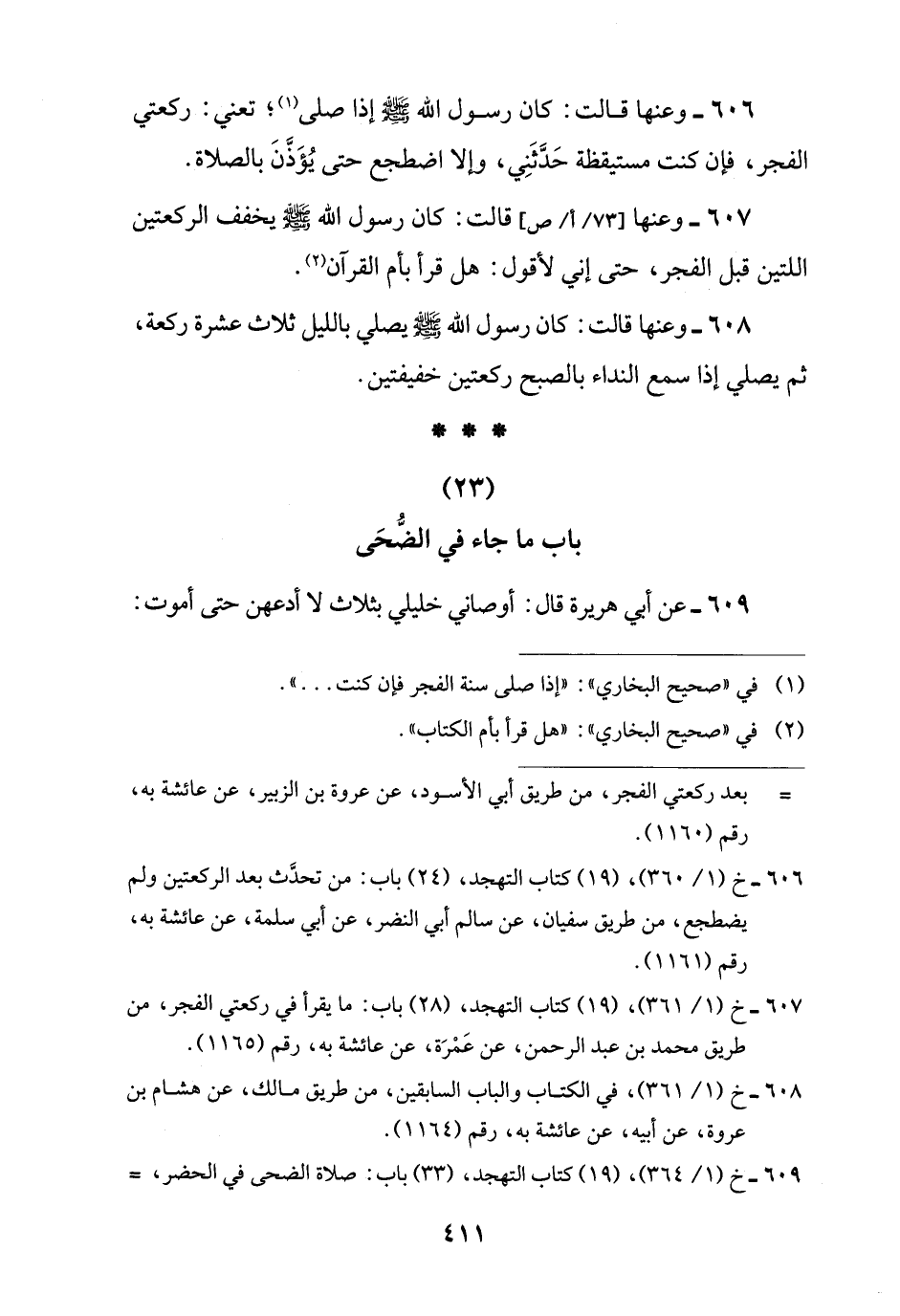606 - خ (1/ 360)، (19) كتاب التهجد، (24) باب: من تحدَّث بعد الركعتين ولم يضطجع، من طريق سفيان، عن سالم أبي النضر، عن أبي سلمة، عن عائشة به، رقم (1161).