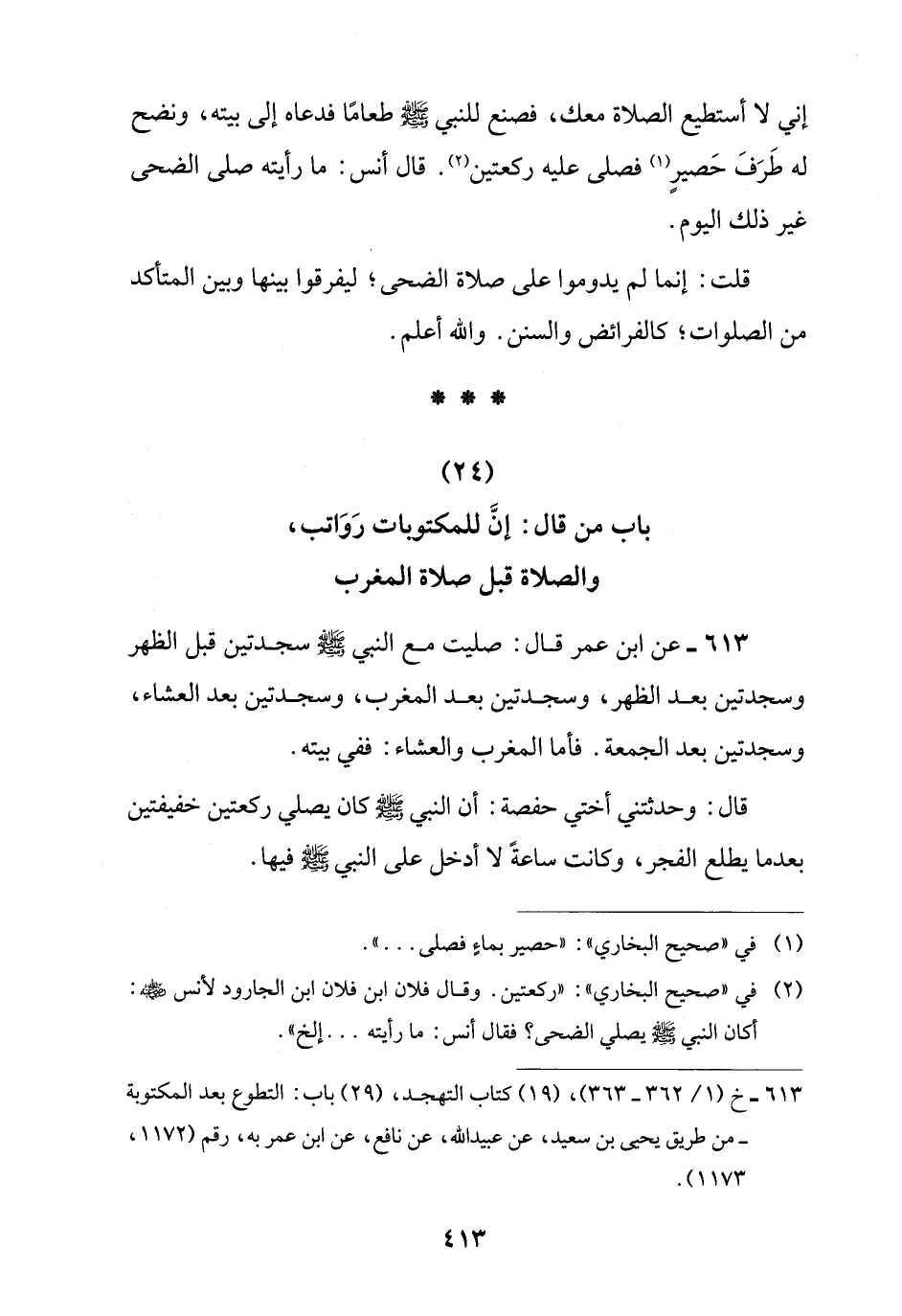 613 - عن ابن عمر قال: صليت مع النبي -صلى اللَّه عليه وسلم- سجدتين قبل الظهر وسجدتين بعد الظهر، وسجدتين بعد المغرب، وسجدتين بعد العشاء، وسجدتين بعد الجمعة. فأما المغرب والعشاء: ففي بيته.
