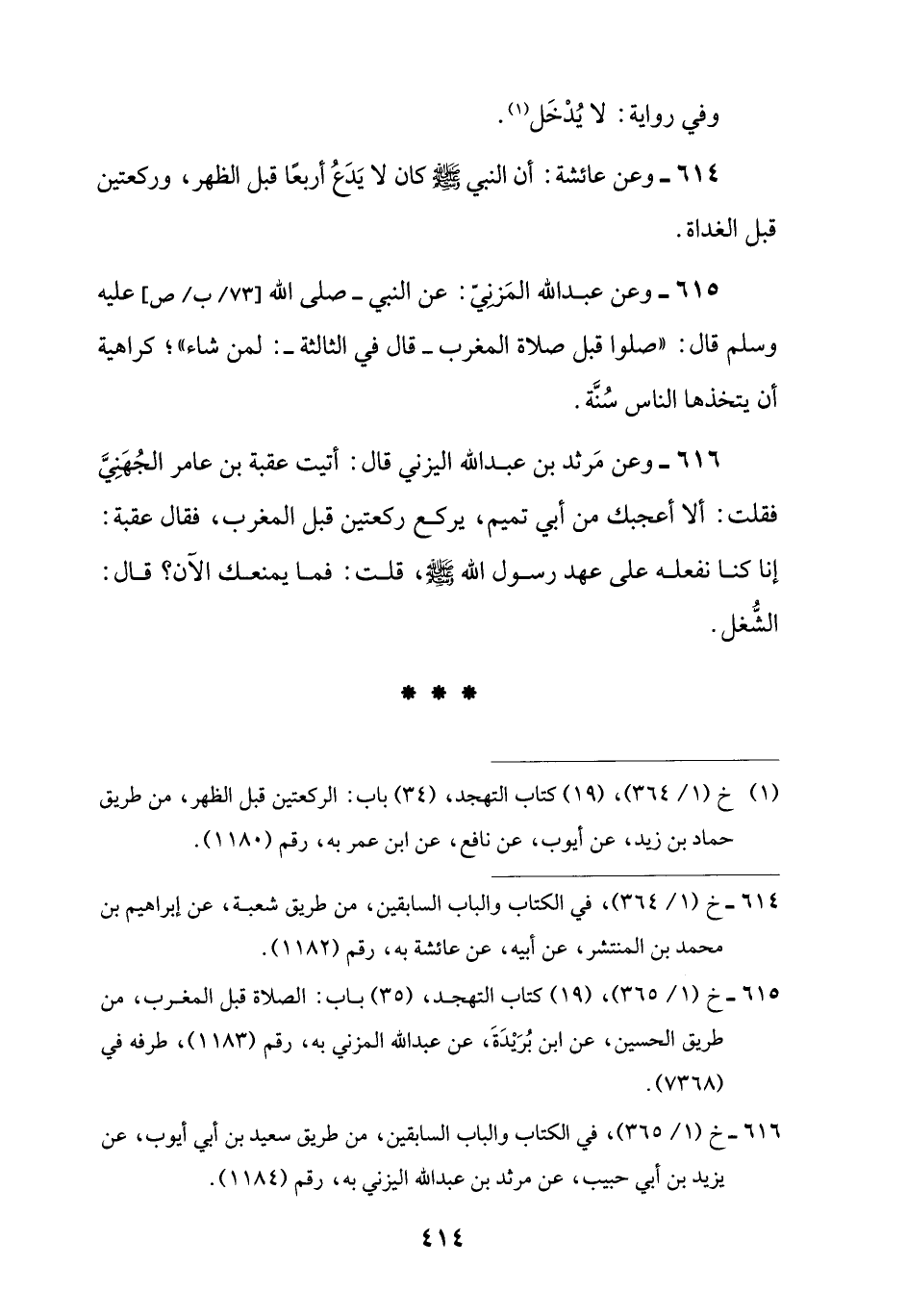 615 - وعن عبد اللَّه المَزنِيّ: عن النبي -صلى اللَّه عليه وسلم- قال: "صلوا قبل صلاة المغرب -قال في الثالثة-: لمن شاء"؛ كراهية أن يتخذها الناس سُنَّة.