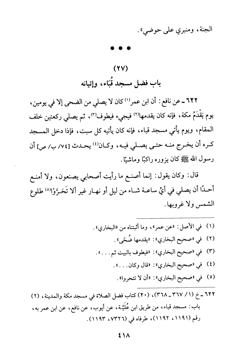 622 - خ (1/ 367 - 368)، (20) كتاب فضل الصلاة في مسجد مكة والمدينة، (2) باب: مسجد قباء، من طريق ابن عُلَيَّة، عن أيوب، عن نافع، عن ابن عمر به، رقم (1191، 1192)، طرفاه في (7326، 1193).