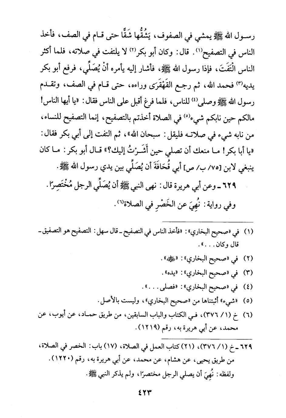 629 - خ (1/ 376)، (21) كتاب العمل في الصلاة، (17) باب: الخصر في الصلاة، من طريق يحيى، عن هشام، عن محمد، عن أبي هريرة به، رقم (1220).