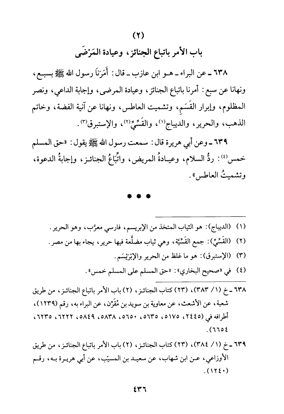 638 - عن البراء -هو ابن عازب- قال: أَمَرَنَا رسول اللَّه -صلى اللَّه عليه وسلم- بسبع، ونهانا عن سبع: أمرنا باتباع الجنائز، وعيادة المرضى، وإجابة الداعي، ونصر المظلوم، وإبرار القَسَمِ، وتشميت العاطس، ونهانا عن آنية الفضة، وخاتم الذهب، والحرير، والديباج (¬1)، والقَسِّيّ (¬2)، والإستبرق (¬3).