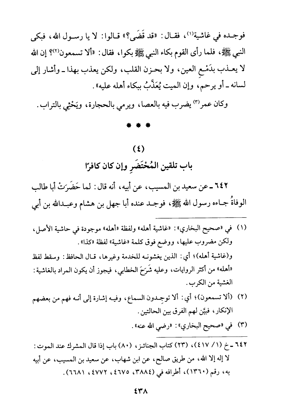 642 - خ (1/ 417)، (23) كتاب الجنائز، (80) باب إذا قال المشرك عند الموت: لا إله إلا اللَّه، من طريق صالح، عن ابن شهاب، عن سعيد بن المسيب، عن أبيه به، رقم (1360)، أطرافه في (3884، 4675، 4772، 6681).