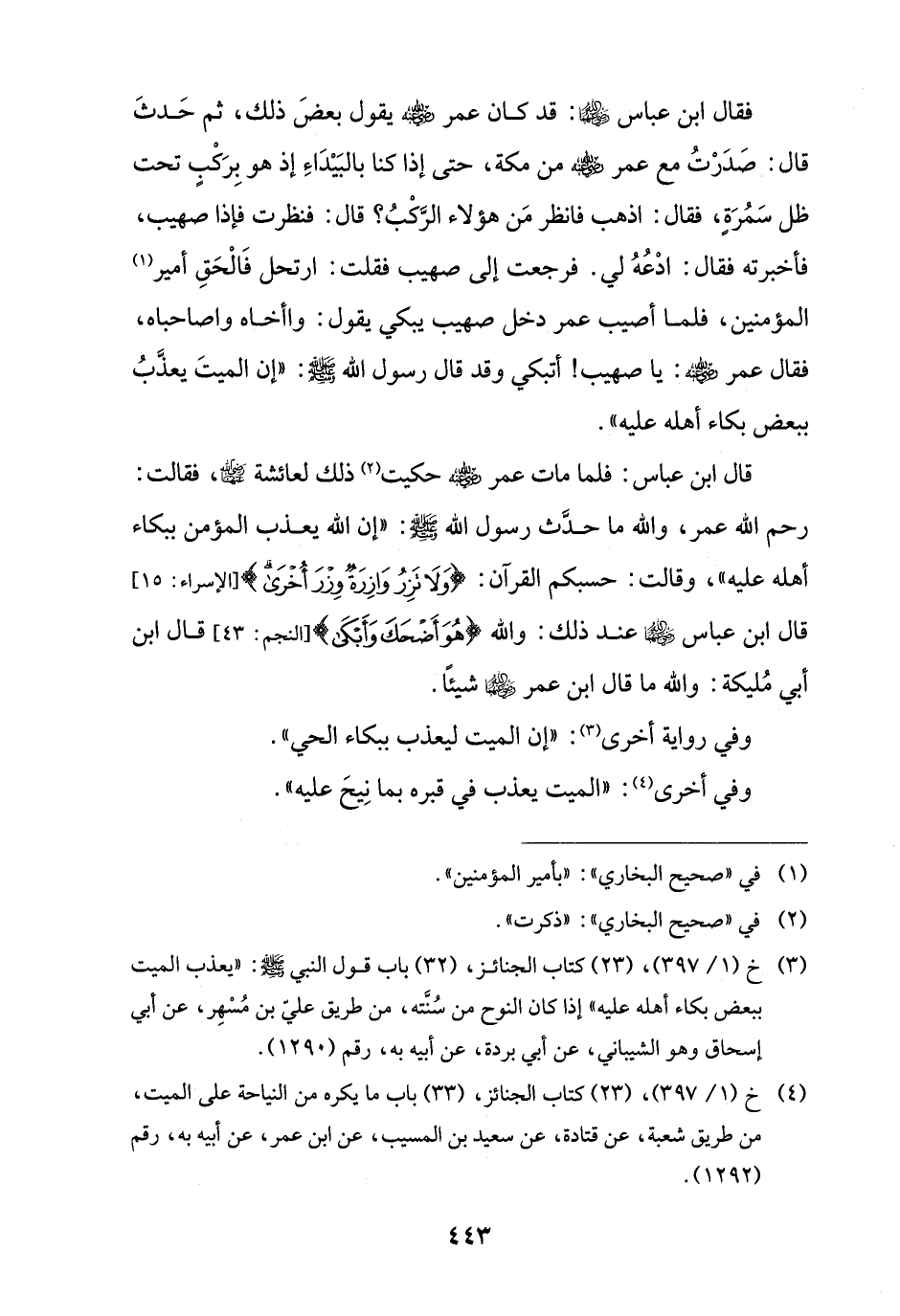 (¬4) خ (1/ 397)، (23) كتاب الجنائز، (33) باب ما يكره من النياحة على الميت، من طريق شعبة، عن قتادة، عن سعيد بن المسيب، عن ابن عمر، عن أبيه به، رقم (1292).
