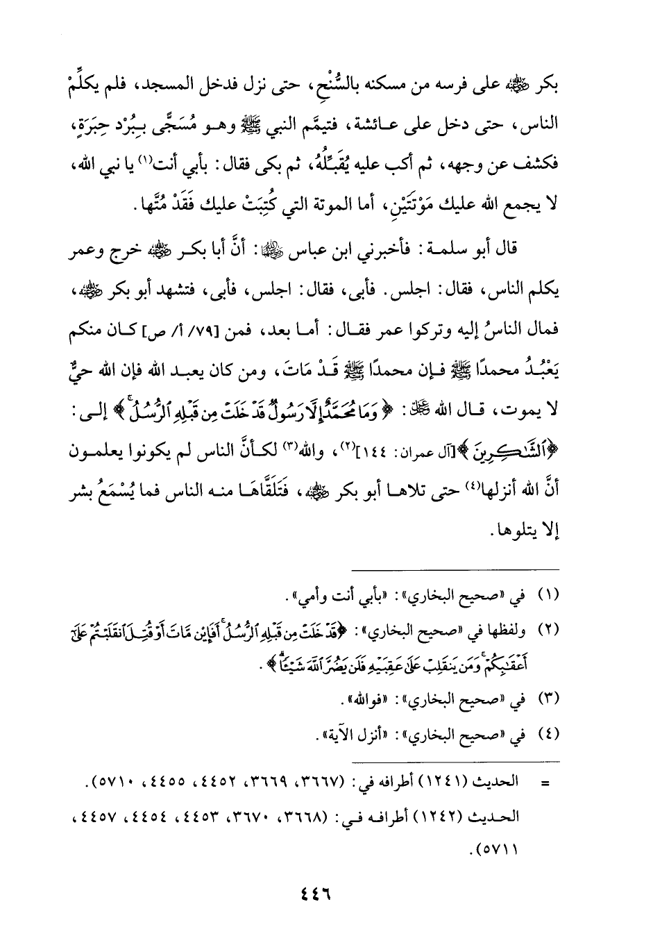 (¬2) ولفظها في "صحيح البخاري": {قَدْ خَلَتْ مِنْ قَبْلِهِ الرُّسُلُ أَفَإِنْ مَاتَ أَوْ قُتِلَ انْقَلَبْتُمْ عَلَى أَعْقَابِكُمْ وَمَنْ يَنْقَلِبْ عَلَى عَقِبَيْهِ فَلَنْ يَضُرَّ اللَّهَ شَيْئًا}.