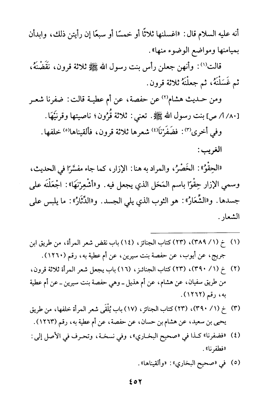 (¬2) خ (1/ 390)، (23) كتاب الجنائز، (16) باب يجعل شعر المرأة ثلاثة قرون، من طريق سفيان، عن هشام، عن أم هذيل -وهي حفصة بنت سيرين- عن أم عطية به، رقم (1262).