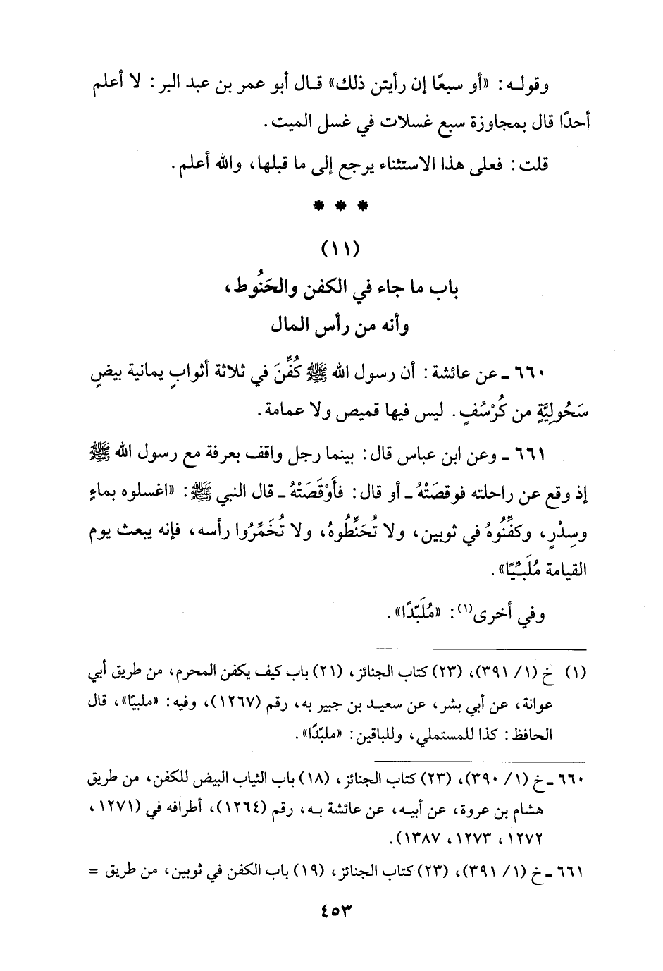 660 - خ (1/ 390)، (23) كتاب الجنائز، (18) باب الثياب البيض للكفن، من طريق هشام بن عروة، عن أبيه، عن عائشة به، رقم (1264)، أطرافه في (1271، 1272، 1273، 1387).