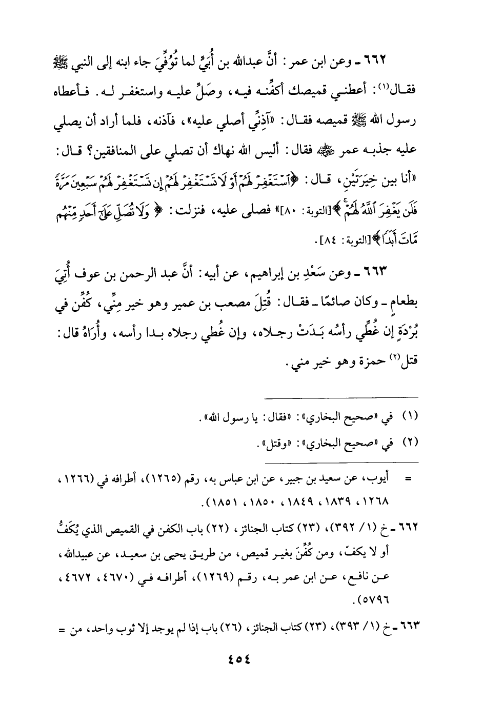 662 - خ (1/ 392)، (23) كتاب الجنائز، (22) باب الكفن في القميص الذي يُكَفُّ أو لا يكفّ، ومن كُفِّنَ بغير قميص، من طريق يحيى بن سعيد، عن عبيد اللَّه، عن نافع، عن ابن عمر به، رقم (1269)، أطرافه في (4670، 4672، 5796).