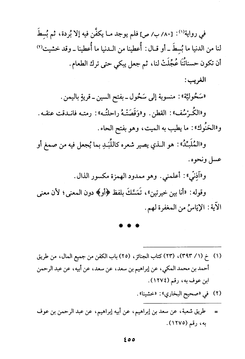 و"الكُرْسُف": القطن. و"وَقَصَتْهُ راحلتُه": رمته فاندقت عنقه. و"الحَنُوك": ما يطيب به الميت، وهو بفتح الحاء.