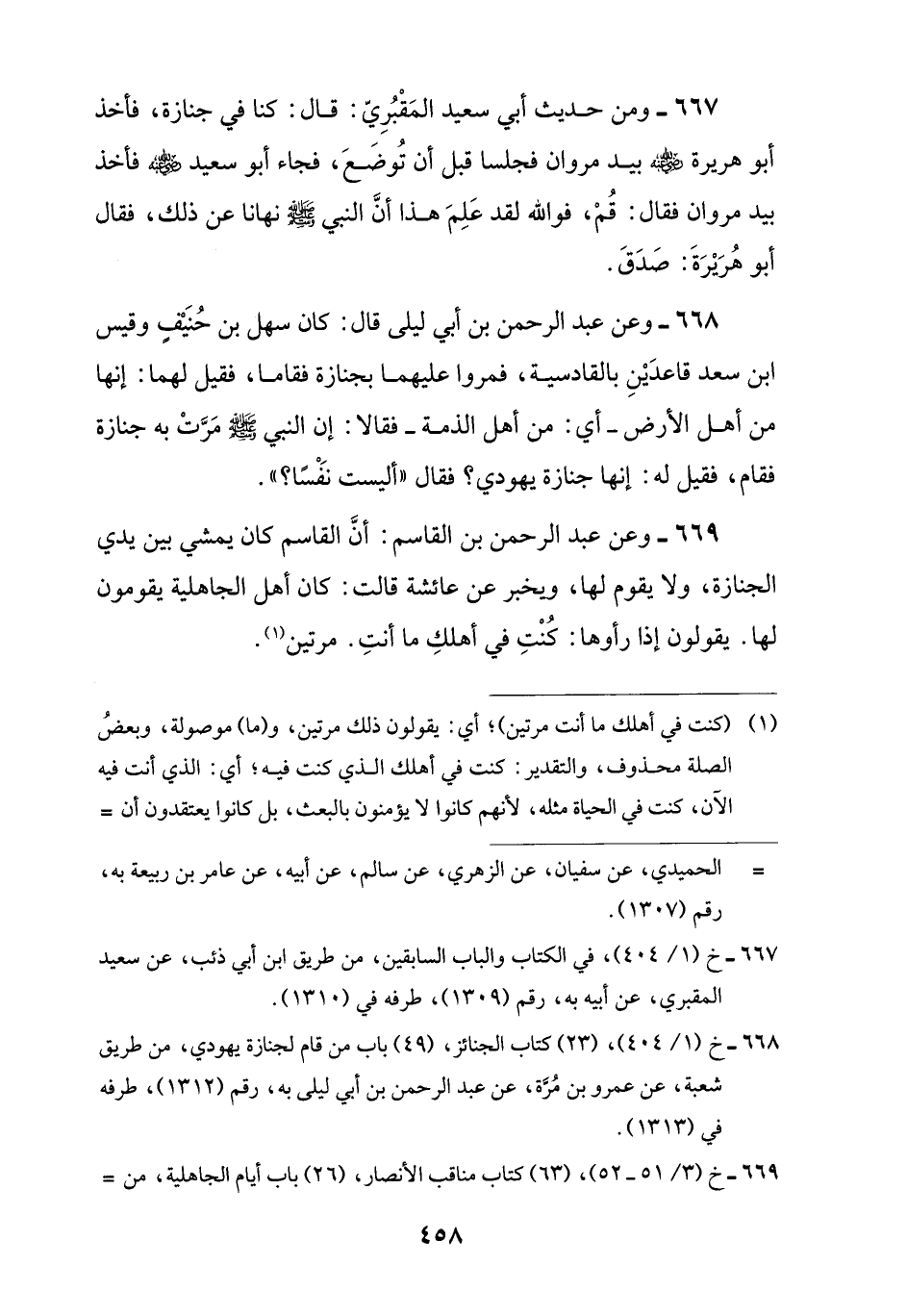 668 - خ (1/ 404)، (23) كتاب الجنائز، (49) باب من قام لجنازة يهودي، من طريق شعبة، عن عمرو بن مُرَّة، عن عبد الرحمن بن أبي ليلى به، رقم (1312)، طرفه في (1313).