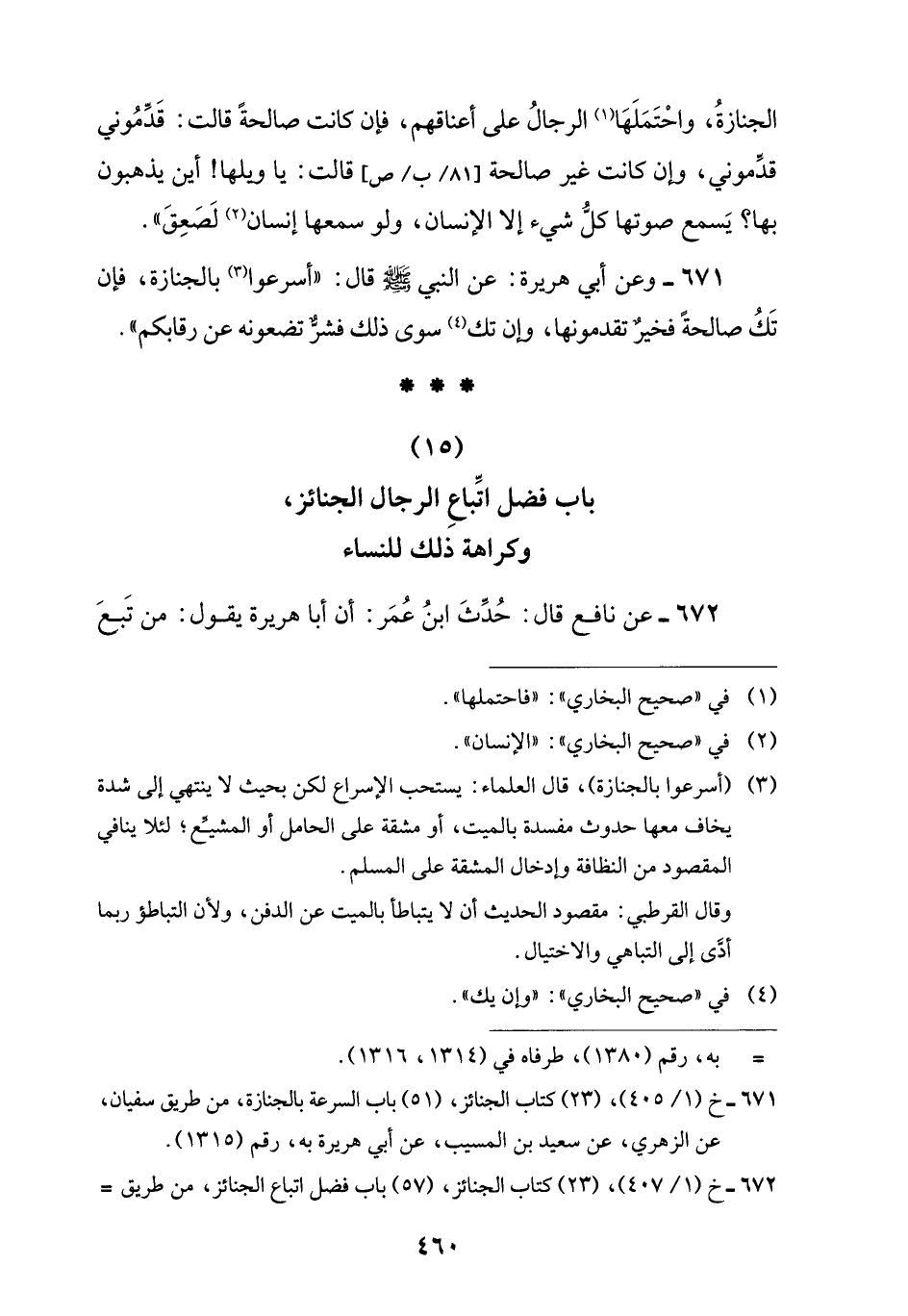 671 - وعن أبي هريرة: عن النبي -صلى اللَّه عليه وسلم- قال: "أسرعوا (¬3) بالجنازة، فإن تَكُ صالحةً فخيرٌ تقدمونها، وإن تك (¬4) سوى ذلك فشرٌّ تضعونه عن رقابكم".