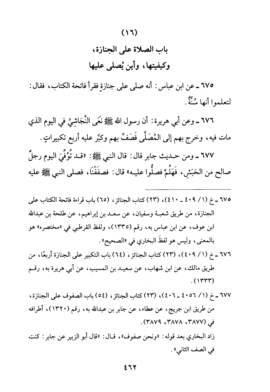 677 - خ (1/ 405 - 406)، (23) كتاب الجنائز، (54) باب الصفوف على الجنازة، من طريق ابن جريج، عن عطاء، عن جابر بن عبد اللَّه به، رقم (1320)، أطرافه في (3877، 3878، 3879).