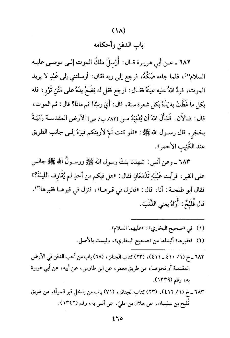 682 - عن أبي هريرة قال: أُرْسِلَ ملكُ الموت إلى موسى عليه السلام (¬1)، فلما جاءه صَكَّهُ، فرجع إلى ربه فقال: أرسلتني إلى عَبْدٍ لا يريد الموت، فردَّ اللَّهُ عليه عينَهُ فقال: ارجع فقل له يَضَعُ يدَهُ على مَتْنِ ثَوْرٍ، فله بكل ما غَطَّتْ به يَدُهُ بكل شعرة سنة، قال: أَيْ ربِّ! ثم ماذا؟ قال: ثم الموت، قال: فالآن. فَسَأَلَ اللَّهَ أن يُدْنِيَهُ من الأرض المقدسة رَمْيَةً بحَجَرٍ، قال رسول اللَّه -صلى اللَّه عليه وسلم-: "فلو كنت ثَمَّ لأريتكم قبرَهُ إلى جانب الطريق عند الكَثِيبِ الأحمر".