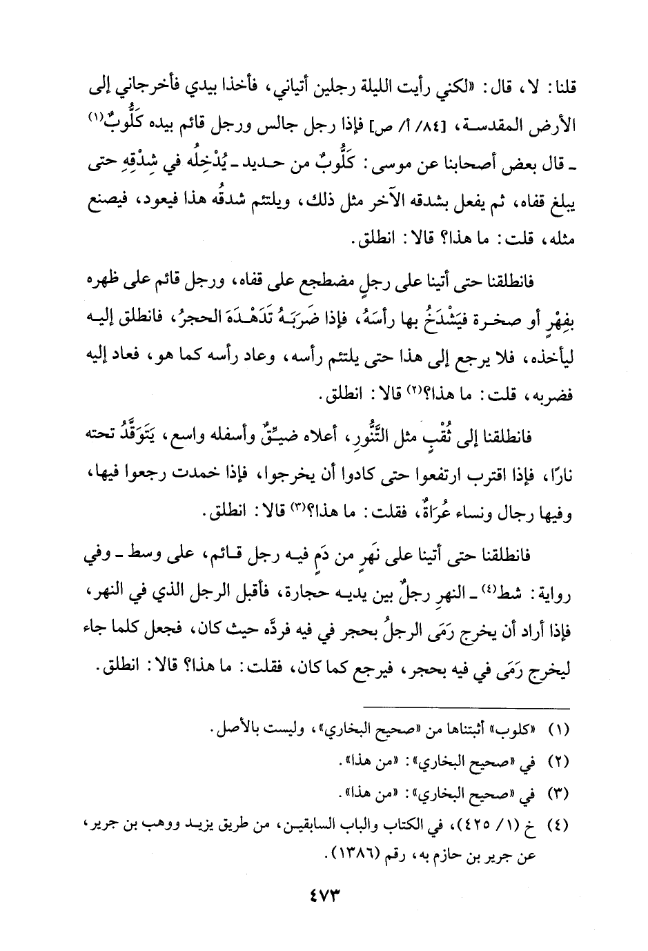 قلنا: لا، قال: "لكني رأيت الليلة رجلين أتياني، فأخذا بيدي فأخرجاني إلى الأرض المقدسة، فإذا رجل جالس ورجل قائم بيده كَلُّوبٌ (¬1) -قال بعض أصحابنا عن موسى: كَلُّوبٌ من حديد- يُدْخِلُه في شِدْقِهِ حتى يبلغ قفاه، ثم يفعل بشدقه الآخر مثل ذلك، ويلتئم شدقُه هذا فيعود، فيصنع مثله، قلت: ما هذا؟ قالا: انطلق.