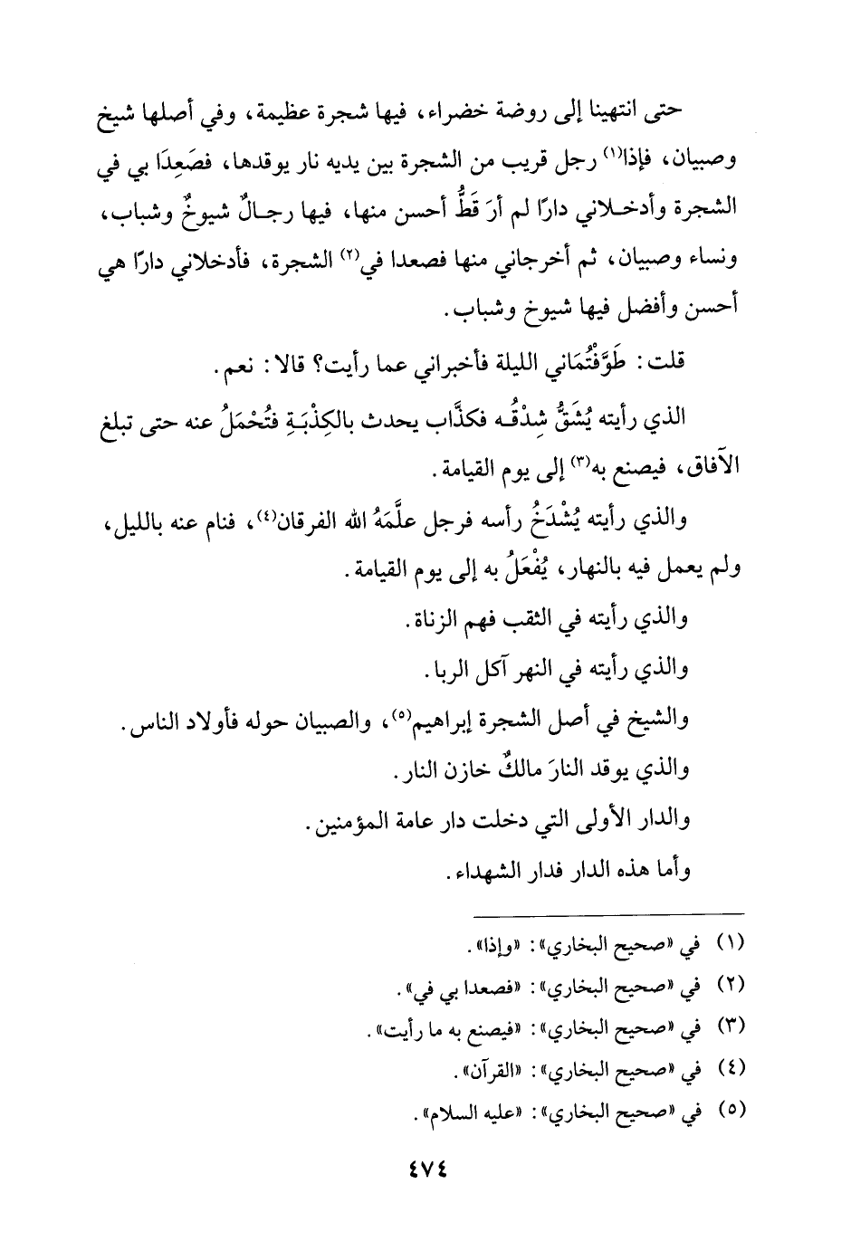 حتى انتهينا إلى روضة خضراء، فيها شجرة عظيمة، وفي أصلها شيخ وصبيان، فإذا (¬1) رجل قريب من الشجرة بين يديه نار يوقدها، فصَعِدَا بي في الشجرة وأدخلاني دارًا لم أرَ قَطُّ أحسن منها، فيها رجالٌ شيوخ وشباب، ونساء وصبيان، ثم أخرجاني منها فصعدا في (¬2) الشجرة، فأدخلاني دارًا هي أحسن وأفضل فيها شيوخ وشباب.