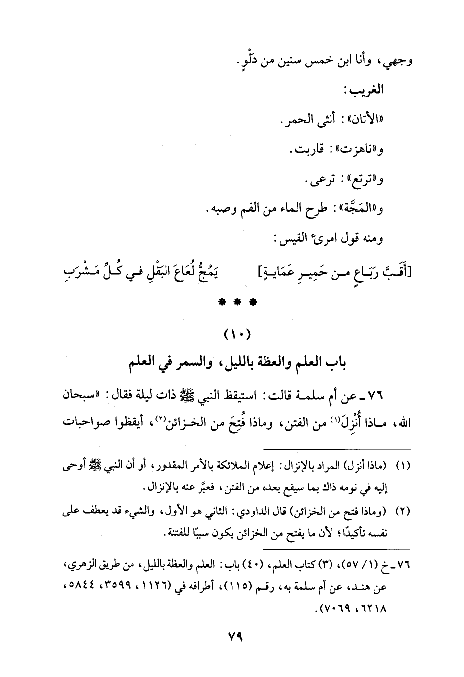 76 - عن أم سلمة قالت: استيقظ النبي -صلى اللَّه عليه وسلم- ذات ليلة فقال: "سبحان اللَّه، ماذا أُنْزِلَ (¬1) من الفتن، وماذا فُتِحَ من الخزائن (¬2)، أيقظوا صواحبات