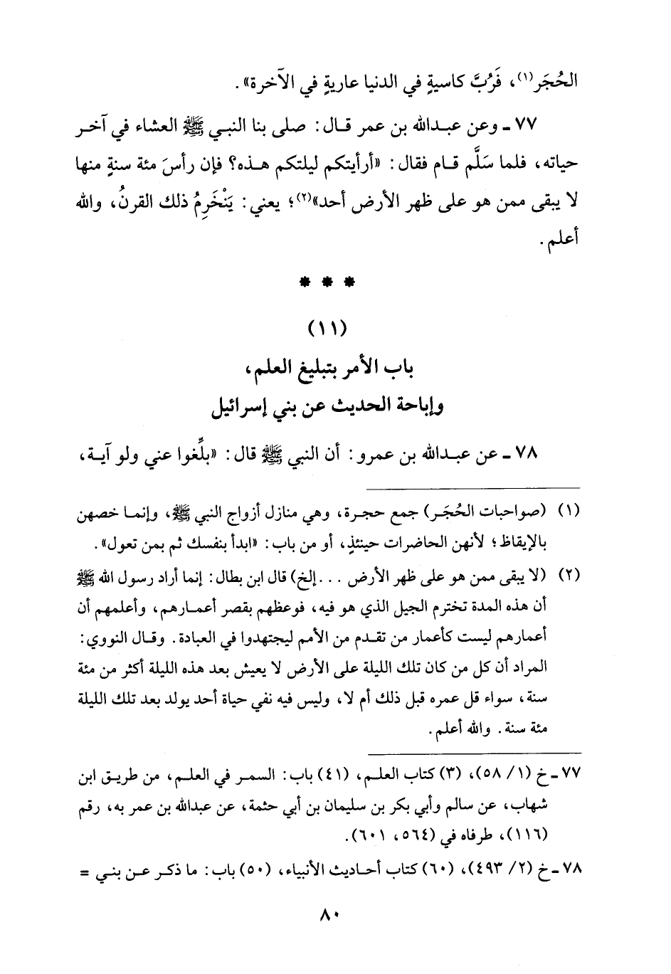 78 - عن عبد اللَّه بن عمرو: أن النبي -صلى اللَّه عليه وسلم- قال: "بلِّغوا عني ولو آية،