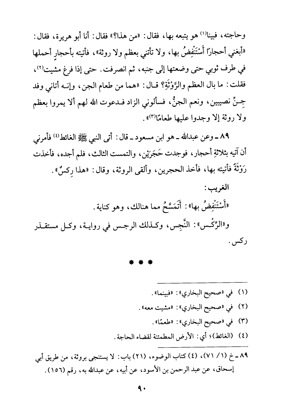 89 - وعن عبد اللَّه -هو ابن مسعود- قال: أتى النبي -صلى اللَّه عليه وسلم- الغائط (¬4) فأمرني أن آتيه بثلاثةِ أحجار، فوجدت حَجَرَيْن، والتمست الثالث، فلم أجده، فأخذت رَوْثَةً فأتيته بها، فأخذ الحجرين، وألقى الروثة، وقال: "هذا رِكسٌ".