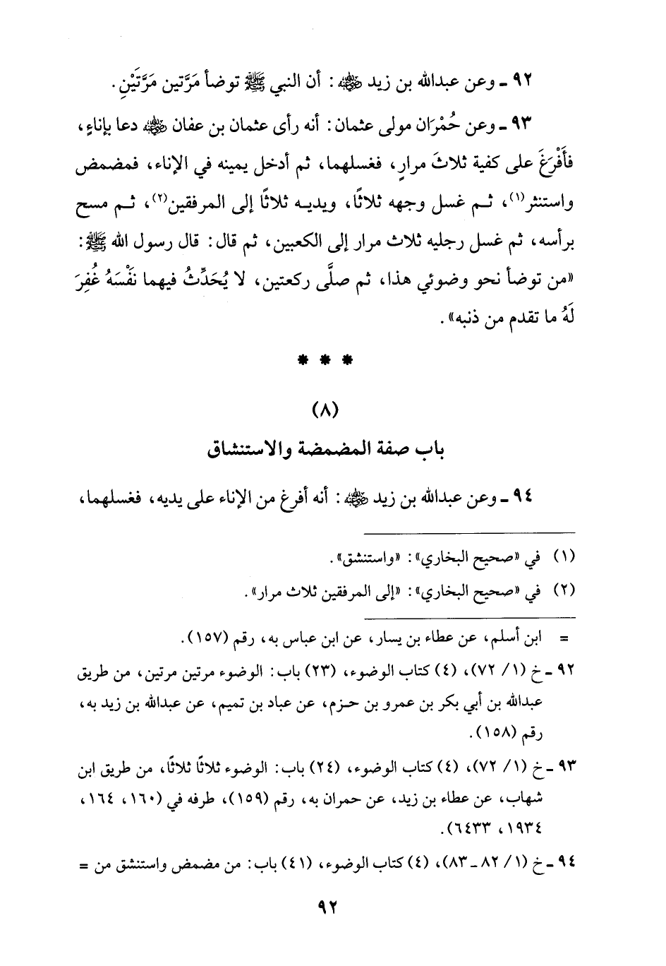 92 - خ (1/ 72)، (4) كتاب الوضوء، (23) باب: الوضوء مرتين مرتين، من طريق عبد اللَّه بن أبي بكر بن عمرو بن حزم، عن عباد بن تميم، عن عبد اللَّه بن زيد به، رقم (158).