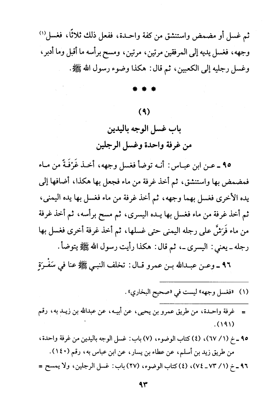 95 - عن ابن عباس: أنه توضأ فغسل وجهه، أخذ غَرْفَةً من ماء فمضمض بها واستنشق، ثم أخذ غرفة من ماء فجعل بها هكذا، أضافها إلى يده الأخرى فغسل بهما وجهه، ثم أخذ غرفة من ماء فغسل بها يده اليمنى، ثم أخذ غرفة من ماء فغسل بها يده اليسرى، ثم مسح برأسه، ثم أخذ غرفة من ماء فَرَشَّ على رجله اليمنى حتى غسلها، ثم أخذ غرفة أخرى فغسل بها رجله -يعني: اليسرى-، ثم قال: هكذا رأيت رسول اللَّه -صلى اللَّه عليه وسلم- يتوضأ.