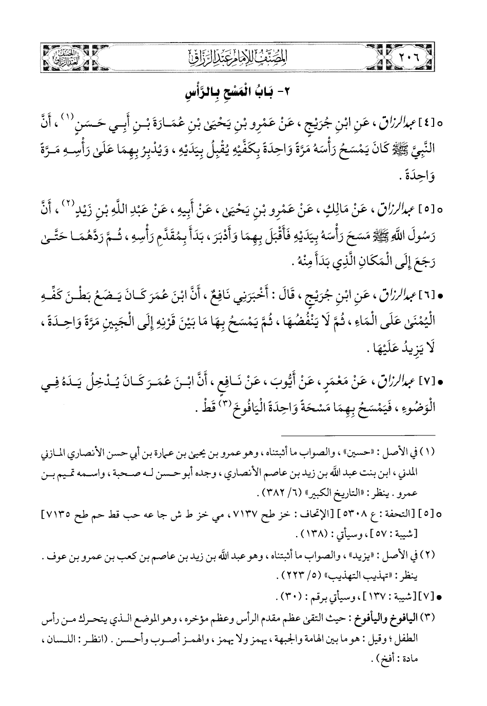 4- عبد الرزاق، عَنِ ابْنِ جُرَيْجٍ، عَنْ عَمْرِو بنِ يَحيَى بنِ عُمَارَةَ بْنِ أَبِي حَسَنٍ، أَنَّ النَّبِيَّ صَلَّى اللهُ عَلَيْهِ وَسَلَّمَ كَانَ يَمْسَحُ رَأْسَهُ مَرَّةً وَاحِدَةً بِكَفَّيْهِ يُقْبِلُ بِيَدَيْهِ، وَيُدْبِرُ بِهِمَا عَلَى رَأْسِهِ مَرَّةً وَاحِدَةً.