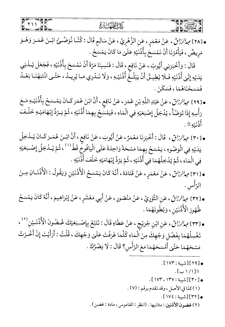 29- عبد الرزاق، عَنْ عَبدِ اللهِ بْنِ عُمَرَ، عَن نَافِعٍ، أَنَّ ابْنَ عُمَرَ كَانَ يَمْسَحُ بِأُذُنَيْهِ مَعَ رَأْسِهِ إِذَا تَوَضَّأَ، يُدْخِلُ إِصْبَعَيْهِ فِي المَاءِ، فَيمسَحُ بِهِمَا أُذُنَيْهِ، ثُمَّ يَرُدُّ إِبْهَامَيْهِ خَلْفَ أُذُنَيْهِ.