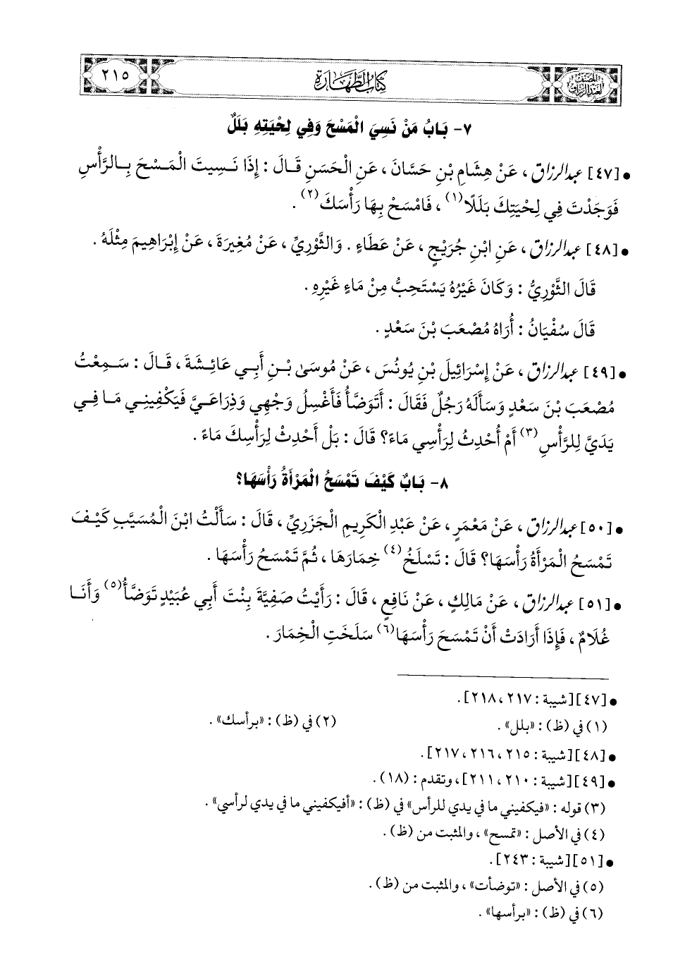 50- عبد الرزاق، عَنْ مَعْمَرٍ، عَنْ عَبدِ الْكَرِيمِ الْجَزَرِيِّ، قَالَ: سَأَلْتُ ابْنَ المُسَيَّبِ: كَيْفَ تَمْسَحُ المَرْأَةُ رَأْسَهَا؟ قَالَ: تَسْلَخُ خِمَارَهَا، ثُمَّ تَمْسَحُ رَأْسَهَا.