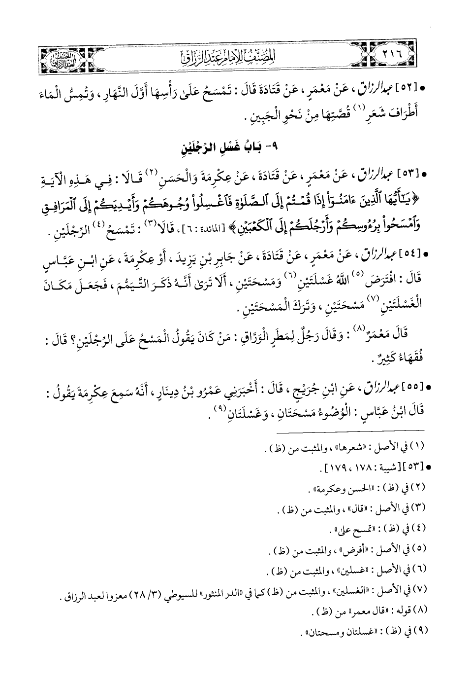 53- عبد الرزاق، عَنْ مَعْمَرٍ، عَن قَتَادَةَ، عَنْ عِكْرِمَةَ، وَالْحَسَنِ، قَالاَ: فِي هَذِهِ الآيَةِ {يَا أَيُّهَا الَّذِينَ آمَنُوا إِذَا قُمْتُمْ إِلَى الصَّلاَةِ فَاغْسِلُوا وُجُوهَكُمْ وَأَيْدِيَكُمْ إِلَى المَرَافِقِ وَامْسَحُوا بِرُؤُوسِكُمْ وَأَرْجُلَكُمْ إِلَى الْكَعْبَيْنِ}، قَالاَ: تَمْسَحُ الرِّجْلَيْنِ.