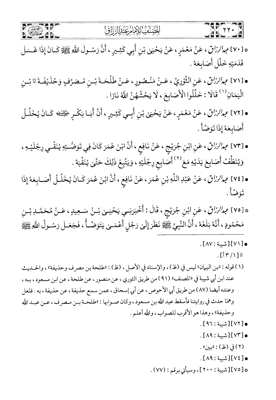 71- عبد الرزاق، عَنِ الثَّورِيِّ، عَنْ مَنصُورٍ، عَن طَلْحَةَ بْنِ مُصَرِّفٍ، وَحُذَيْفَةَ بْنِ الْيَمَانِ، قَالاَ: خَلِّلُوا الأَصَابِعَ لاَ يَحْشُهُنَّ اللهُ نَارًا.