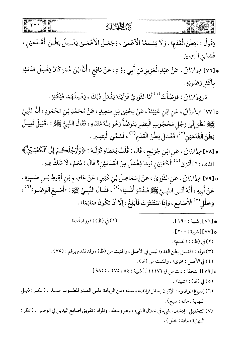 76- عبد الرزاق، عَنْ عَبدِ الْعَزِيزِ بْنِ أَبِي رَوَّادٍ، عَن نَافِعٍ، أَنَّ ابْنَ عُمَرَ كَانَ يَغْسِلُ قَدَمَيْهِ بِأَكْثَرِ وَضُوئِهِ.