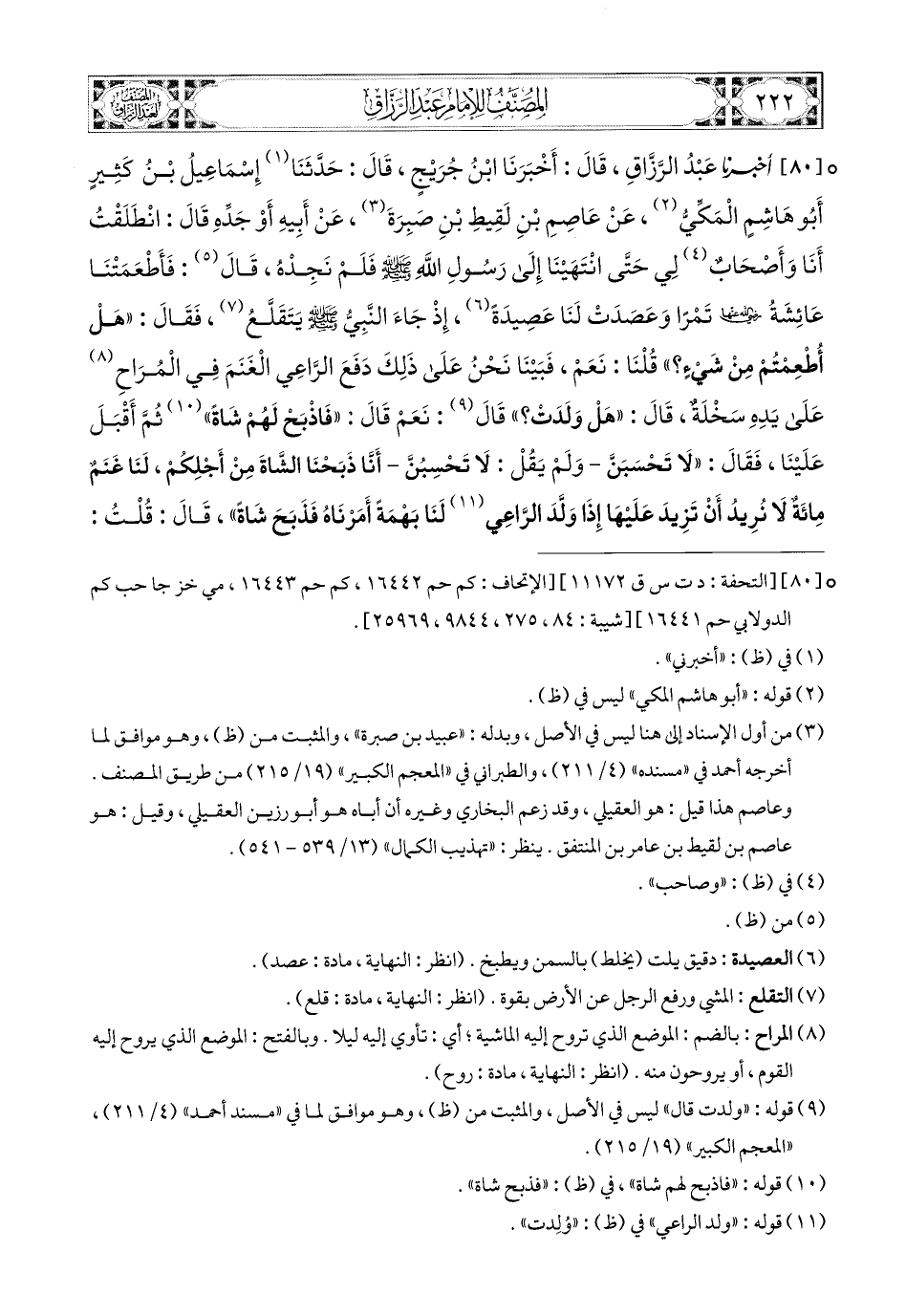 80- أخبرنا عبد الرزاق، قَالَ: أَخْبَرَنَا ابْنُ جُرَيْجٍ، قَالَ: حَدَّثنا إِسْمَاعِيلُ بن كَثِيرٍ، أَبُو هَاشِمٍ الْمَكِّيُّ، عَنْ عَاصِمِ بْنِ لَقِيطِ بْنِ صَبِرَةَ، عَنْ أَبِيهِ، أَوْ جَدِّهِ قَالَ: انْطَلَقْتُ أَنَا وَأَصْحَابٌ لِي، حَتَّى انْتَهَيْنَا إِلَى رَسُولِ اللهِ صَلَّى اللهُ عَلَيْهِ وَسَلَّمَ، فَلَمْ نَجِدْهُ، قَالَ: فَأَطْعَمَتْنَا عَائِشَةُ رضي الله عنها تَمْرًا، وَعَصَدَتْ لَنَا عَصِيدَةً، إِذْ جَاءَ النَّبِيُّ صَلَّى اللهُ عَلَيْهِ وَسَلَّمَ يَتَقَلَّعُ، فَقَالَ: هَلْ أُطْعِمْتُمْ مِنْ شَيْءٍ؟ قُلْنَا: نَعَمْ، فَبَيْنَا نَحْنُ عَلَى ذَلِكَ دَفَعَ الرَّاعِي الْغَنَمَ فِي الْمُرَاحِ عَلَى يَدِهِ سَخْلَةٌ، قَالَ: هَلْ وَلدت؟ قَالَ: نَعَمْ، قَالَ: فَاذْبَحْ لَهُمْ شَاةً، ثُمَّ أَقْبَلَ عَلَيْنَا فَقَالَ: لاَ تَحْسَبَنَّ، وَلَمْ يَقُلْ: لاَ تَحْسِبُنَّ أَنَّا ذَبَحْنَا الشَّاةَ مِنْ أَجْلِكُمْ، لَنَا غَنَمٌ مِئَةٌ، لاَ نُرِيدُ أَنْ تَزِيدَ عَلَيْهَا إِذَا وَلَّدَ الرَّاعِي لَنَا بَهْمَةً أَمَرْنَاهُ، فَذَبَحَ شَاةً، قَالَ: قُلْتُ: يَا رَسُولَ اللهِ، أَخْبِرْنِي عَنِ الْوُضُوءِ، قَالَ: إِذَا تَوَضَّأْتَ فَأَسْبِغْ، وَخَلِّلْ بَيْنَ الأَصَابِعِ، وَإِذَا اسْتَنْثَرْتَ فَأَبْلِغْ، إِلاَّ أَنْ تَكُونَ صَائِمَا، قَالَ: قُلْتُ: يَا رَسُولَ اللهِ، إِنَّ لِي امْرَأَةً فَذَكَرَ مِنْ طُولِ لِسَانِهَا وَبَذَائِهَا، فَقَالَ: طَلِّقْهَا، قَالَ: قُلْتُ: يَا رَسُولَ اللهِ، إِنَّهَا ذَاتُ صُحْبَةٍ وَوَلَدٍ، قَالَ: أَمْسِكْهَا، وَأْمُرْهَا، فَإِنْ يَكُ فِيهَا خَيْرٌ فَسَتَفْعَلُ، وَلاَ تَضْرِبْ ظَعِينَتَكَ ضَرْبَكَ أَمَتِكَ.