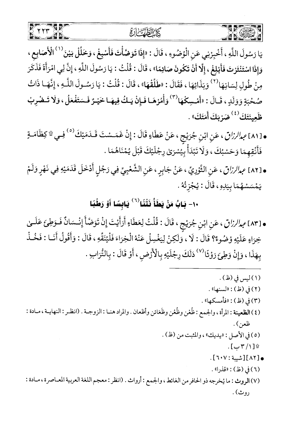 81- عبد الرزاق، عَنِ ابْنِ جُرَيْجٍ، عَنْ عَطَاءٍ، قَالَ: إِنْ غَمَسْتَ قَدَمَيْكَ فِي كِظَامَةٍ فَأَنْقِهِمَا وَحَسْبُكَ، وَلاَ تَبْدَأْ بِيُسْرَى رِجْلَيْكَ قَبْلَ يُمْنَاهُمَا.