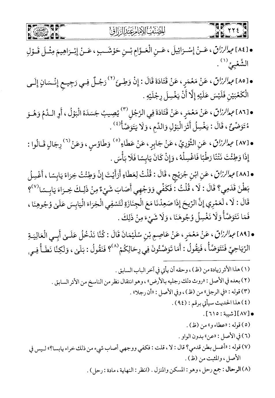 89- عبد الرزاق، عَنْ مَعْمَرٍ، عَنْ عَاصِمِ بْنِ سُلَيْمَانَ، قَالَ: كُنَّا نَدْخُلُ عَلَى أَبِي الْعَالِيَةِ الرِّيَاحِيِّ فَنَتَوَضَّأُ، فَيَقُولُ: أَمَا تَوَضَّؤُونَ فِي رِحَالِكُمْ؟ فَنَقُولُ: بَلَى، وَلَكِنَّا نَطَأُ فِي الْقِشْبِ، قَالَ: فَلاَ وُضُوءَ عَلَيْكُمْ، أَلاَ أُخْبِرُكُمْ بِأَشَدَّ مِنْ ذَلِكَ، إِنَّ الرِّيحَ تُطَيِّرُهُ فِي رُؤُوسِكُمْ وَلِحَاكُمْ.