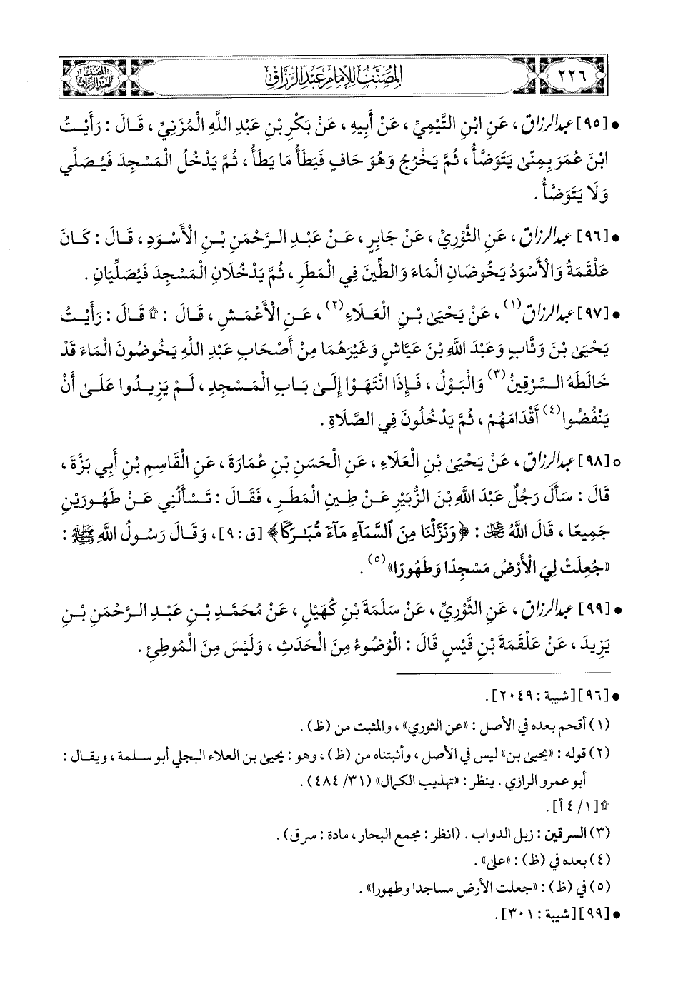 97 - عبد الرزاق (1)، عَن يَحيَى بنِ الْعَلاَءِ، عَنِ الأَعمَشِ، قَالَ: قَالَ: رَأَيْتُ يَحيَى بن وَثَّابٍ، وَعَبْدَ اللهِ بن عَيَّاشٍ، وَغَيْرَهُمَا مِنْ أَصْحَابِ عَبدِ اللهِ يَخُوضُونَ المَاءَ قَدْ خَالَطَهُ السِّرْقِينُ وَالْبَوْلُ، فَإِذَا انْتَهَوْا إِلَى بَابِ المَسْجِدِ لَمْ يَزِيدُوا عَلَى أَنْ يَنْفُضُوا أَقْدَامَهُمْ، ثُمَّ يَدْخُلُونَ فِي الصَّلاَةِ.