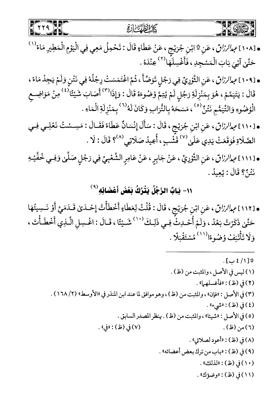 111- عبد الرزاق، عَنِ الثَّورِيِّ، عَن جَابِرٍ، عَنْ عَامِرٍ الشَّعْبِيِّ؛ فِي رَجُلٍ صَلَّى وَفِي خُفَّيْهِ نَتْنٌ؟ قَالَ: يُعِيدُ.