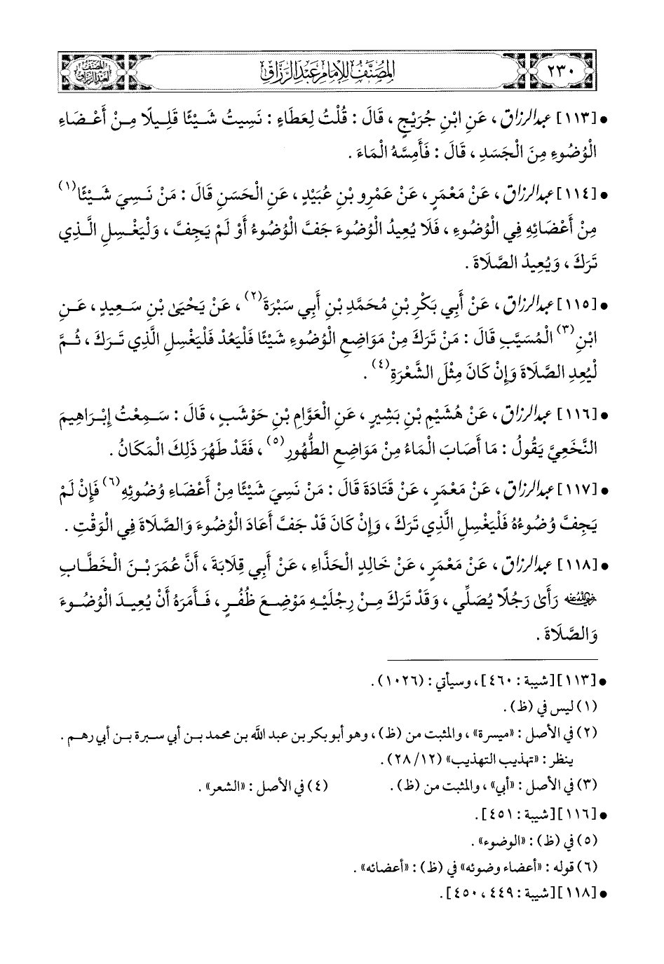 118- عبد الرزاق، عَنْ مَعْمَرٍ، عَن خَالِدٍ الْحَذَّاءِ، عَنْ أَبِي قِلاَبَةَ، أَنَّ عُمَرَ بن الْخَطَّابِ رضي الله عنه رَأَى رَجُلاً يُصَلِّي، وَقَدْ تَرَكَ مِنْ رِجْلَيْهِ مَوْضِعَ ظُفُرٍ، فَأَمَرَهُ أَنْ يُعِيدَ الْوُضُوءَ وَالصَّلاَةَ.