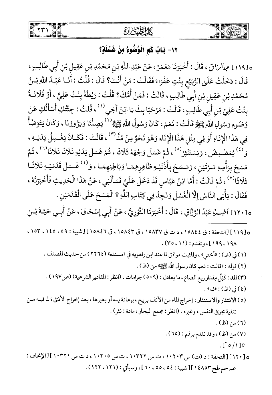 119 - عبد الرزاق، قَالَ: أَخْبَرَنَا مَعْمَرٌ، عَنْ عَبدِ اللهِ بْنِ مُحَمَّدِ بْنِ عَقِيلِ بْنِ أَبِي طَالِبٍ، قَالَ: دَخَلْتُ عَلَى الرُّبَيِّعِ بِنْتِ عَفْرَاءَ، فَقَالَتْ: مَنْ أَنْتَ؟ قَالَ: قُلْتُ: أَنَا عَبدُ اللهِ بْنُ مُحَمَّدِ بْنِ عَقِيلِ بْنِ أَبِي طَالِبٍ، قَالَتْ: فَمَنْ أُمُّكَ؟ قُلْتُ: رَيْطَةُ بِنْتُ عَلِيٍّ، أَوْ فُلاَنَةُ بِنْتُ عَلِيِّ بْنِ أَبِي طَالِبٍ، قَالَتْ: مَرْحَبًا بِكَ يَا ابْنَ أَخِي، قُلْتُ: جِئْتُكِ أَسْأَلُكَ عَنْ وُضُوءِ رَسُولِ اللهِ صَلَّى اللهُ عَلَيْهِ وَسَلَّمَ؟ قَالَتْ: نَعْمْ، كَانَ رَسُولُ اللهِ صَلَّى اللهُ عَلَيْهِ وَسَلَّمَ يَصِلُنَا وَيَزُورُنَا، وَكَانَ يَتَوَضَّأُ فِي هَذَا الإِنَاءِ، أَوْ فِي مِثْلِ هَذَا الإِنَاءِ، وَهُوَ نَحْوٌ مِنْ مُدٍّ، قَالَتْ: فَكَانَ يَغْسِلُ يَدَيْهِ، وَيُمَضْمِضُ، وَيَسْتَنْثِرُ، ثُمَّ غَسَلَ وَجْهَهُ ثَلاَثًا، ثُمَّ غَسَلَ يَدَيْهِ ثَلاَثًا ثَلاَثًا، ثُمَّ مَسَحَ بِرَأْسِهِ مَرَّتَيْنِ، وَمَسَحَ بِأُذُنَيْهِ ظَاهِرِهِمَا وَبَاطِنِهِمَا، وَغَسَلَ قَدَمَيْهِ ثَلاَثًا ثَلاَثًا، ثُمَّ قَالَتْ: أَمَّا ابْنُ عَبَّاسٍ قَدْ دَخَلَ عَلَيَّ فَسَأَلَنِي عَن هَذَا الْحَدِيثِ فَأَخْبَرْتُهُ، فَقَالَ: يَأْبَى النَّاسُ إِلاَّ الْغُسْلَ، وَنَجِدُ فِي كِتَابِ اللهِ المَسْحَ عَلَى الْقَدَمَيْنِ.