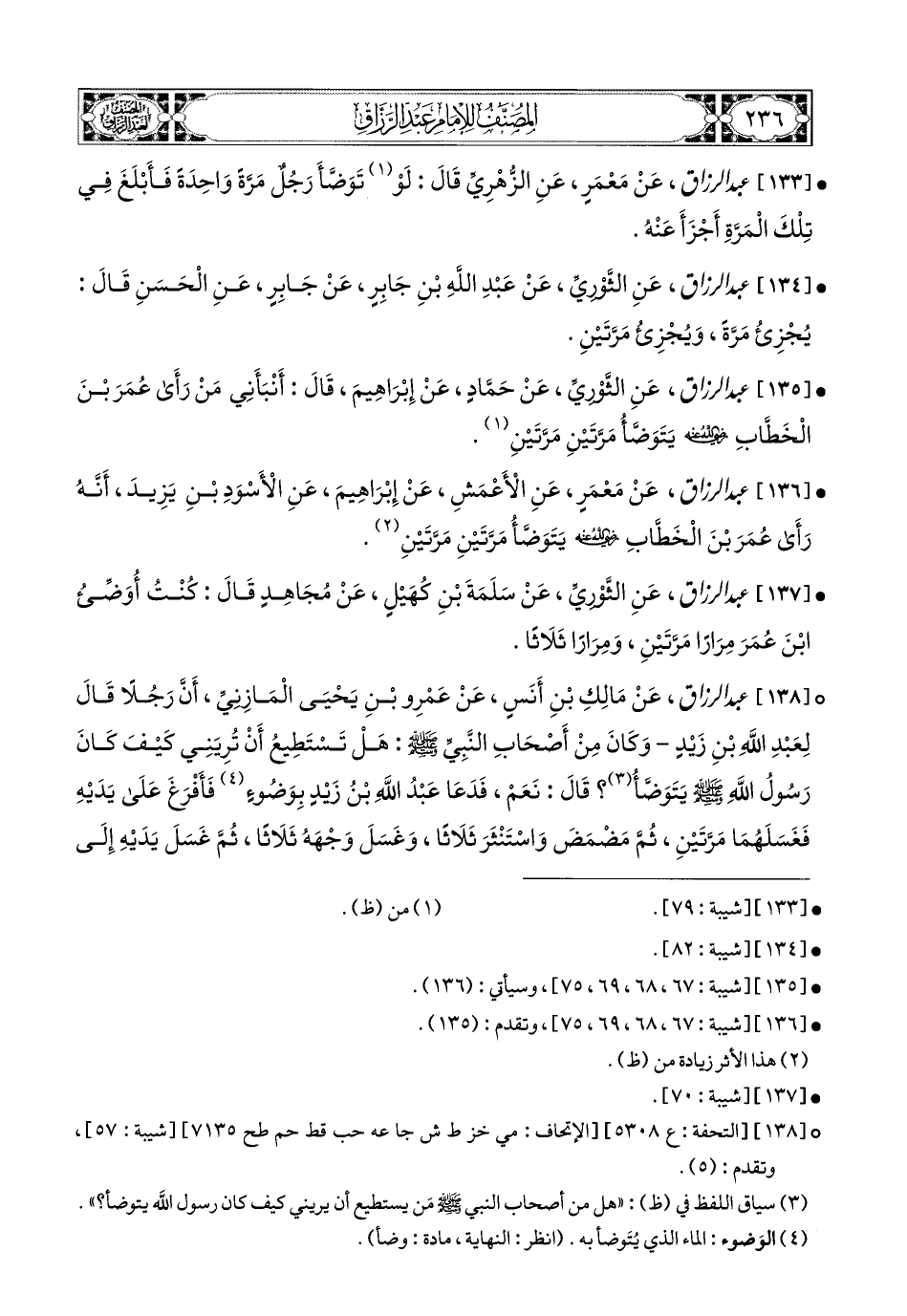 136- عبد الرزاق، عَنْ مَعْمَرٍ، عَنِ الأَعمَشِ، عَن إِبرَاهِيمَ، عَنِ الأَسْوَدِ بْنِ يَزِيدَ، أَنَّهُ رَأَى عُمَرَ بن الْخَطَّابِ رَضِيَ اللهُ عَنْهُ يَتَوَضَّأُ مَرَّتَيْنِ مَرَّتَيْنِ.
