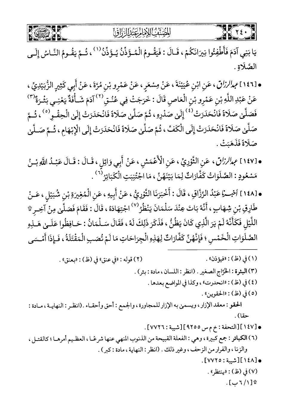 147- عبد الرزاق، عَنِ الثَّورِيِّ، عَنِ الأَعمَشِ، عَنْ أَبِي وَائِلٍ قَالَ: قَالَ عَبدُ اللهِ بن مَسْعُودٍ: الصَّلَوَاتُ كَفَّارَاتٌ لِمَا بَيْنَهُنَّ، مَا اجْتُنِبَتِ الْكَبَائِرُ.