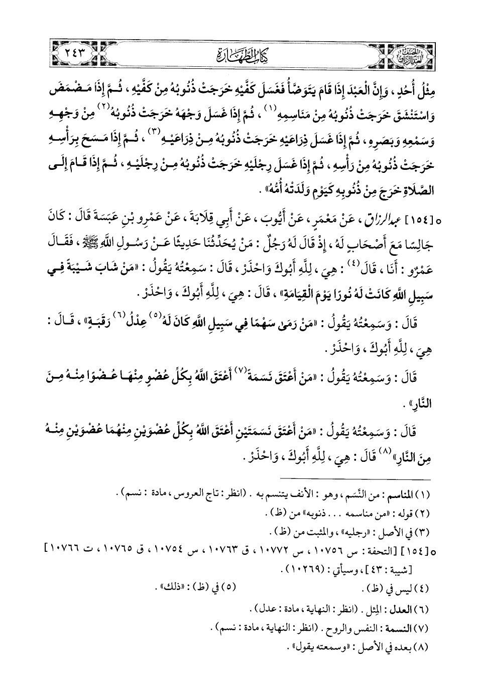 154- عبد الرزاق، عَنْ مَعْمَرٍ، عَنْ أَيُّوبَ، عَنْ أَبِي قِلاَبَةَ، عَنْ عَمْرِو بنِ عَبَسَةَ، قَالَ: كَانَ جَالِسًا مَعَ أَصْحَابٍ لَهُ، إِذْ قَالَ لَهُ رَجُلٌ: مَنْ يُحَدِّثُنَا حَدِيثًا عَن رَسُولِ اللهِ صَلَّى اللهُ عَلَيْهِ وَسَلَّمَ؟ فَقَالَ عَمْرٌو: أَنَا، قَالَ: هِيَ، للهِ أَبوكَ وَاحْذَرْ، قَالَ: سَمِعْتُهُ يَقُولُ: مَنْ شَابَ شَيْبَةً فِي سَبِيلِ اللهِ كَانَتْ لَهُ نُورًا يَوْمَ الْقِيَامَةِ قَالَ: هِيَ، للهِ أَبوكَ وَاحْذَرْ.