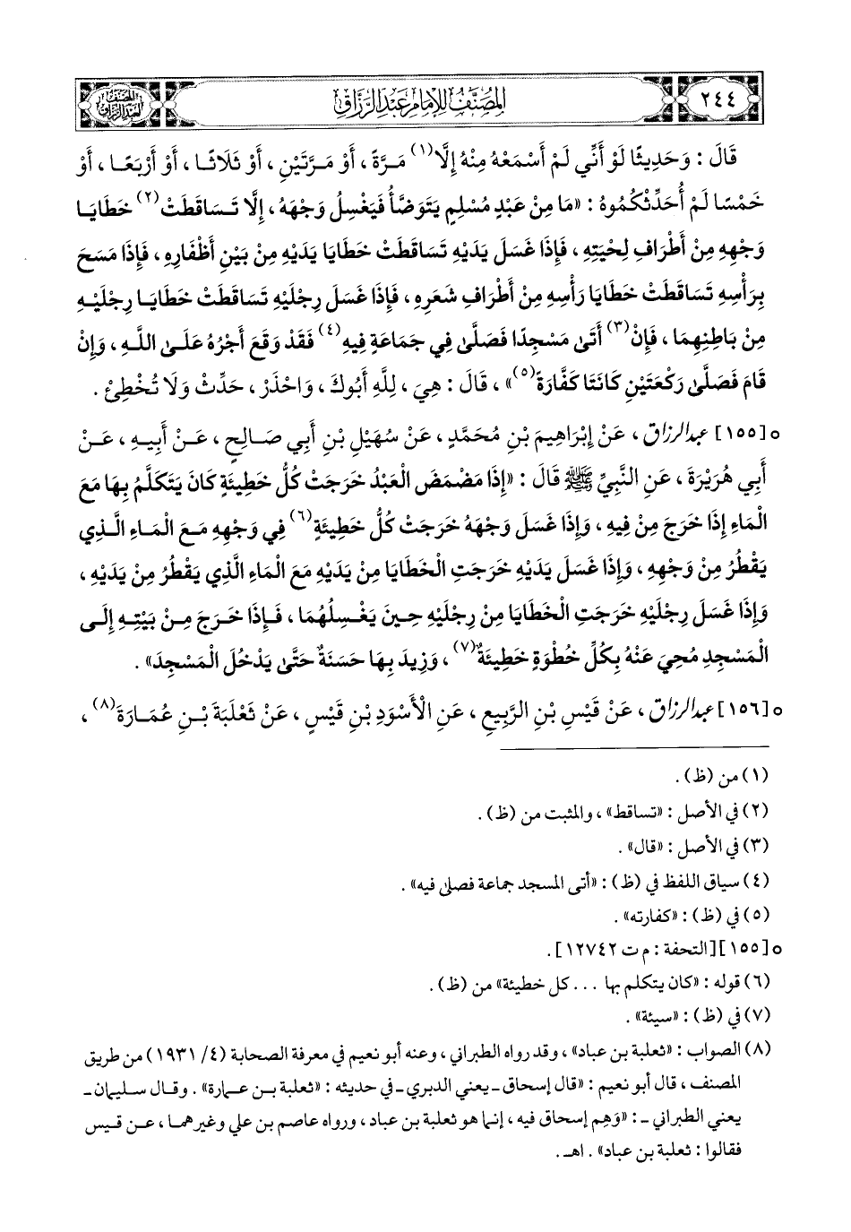155- عبد الرزاق، عَن إِبرَاهِيمَ بْنِ مُحَمَّدٍ، عَن سُهَيْلِ بْنِ أَبِي صَالِحٍ، عَنْ أَبِيهِ، عَنْ أَبِي هُرَيرَةَ، عَنِ النَّبِيِّ صَلَّى اللهُ عَلَيْهِ وَسَلَّمَ قَالَ: إِذَا مَضْمَضَ الْعَبْدُ خَرَجَتْ كُلُّ خَطِيئَةٍ كَانَ يَتَكَلَّمُ بِهَا مَعَ المَاءِ إِذَا خَرَجَ مِنْ فِيهِ، وَإِذَا غَسَلَ وَجْهَهُ خَرَجَتْ كُلُّ خَطِيئَةٍ فِي وَجْهِهِ مَعَ المَاءِ الَّذِي يَقْطُرُ مِنْ وَجْهِهِ، وَإِذَا غَسَلَ يَدَيْهِ، خَرَجَتِ الْخَطَايَا مِنْ يَدَيْهِ مَعَ المَاءِ الَّذِي يَقْطُرُ مِنْ يَدَيْهِ، وَإِذَا غَسَلَ رِجْلَيْهِ خَرَجَتِ الْخَطَايَا مِنْ رِجْلَيْهِ حِينَ يَغْسِلُهُمَا، فَإِذَا خَرَجَ مِنْ بَيْتِهِ إِلَى المَسْجِدِ مُحِيَ عَنْهُ بِكُلِّ خُطْوَةٍ خَطِيئَةٌ، وَزِيدَ بِهَا حَسَنَةً، حَتَّى يَدْخُلَ المَسْجِدَ.