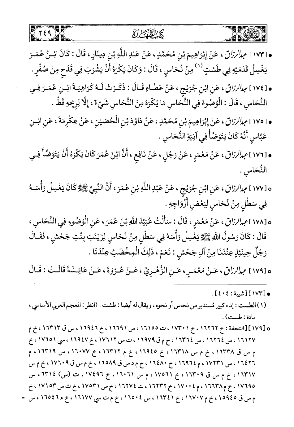 178- عبد الرزاق، عَنْ مَعْمَرٍ، قَالَ: سَأَلْتُ عَبْيدَ اللهِ بن عُمَرَ عَنِ الْوُضُوءِ فِي النُّحَاسِ، قَالَ: كَانَ رَسُولُ اللهِ صَلَّى اللهُ عَلَيْهِ وَسَلَّمَ يَغْسِلُ رَأْسَهُ فِي سَطْلٍ مِنْ نُحَاسٍ لِزَيْنَبَ بِنْتِ جَحْشٍ. فَقَالَ رَجُلٌ حِينَئِذٍ عِنْدَنَا مِنْ آلِ جَحْشٍ: نَعَمْ، ذَلِكَ المِخْضَبُ عِنْدَنَا.