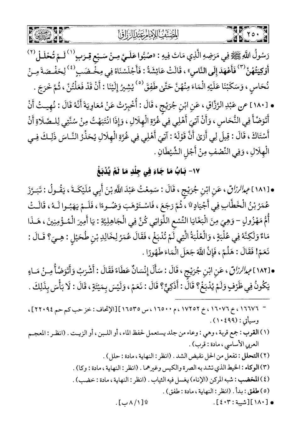 182- عبد الرزاق، عَنِ ابْنِ جُرَيْجٍ، قَالَ: سَأَلَ إِنْسَانٌ عَطَاءً، فَقَالَ: أَشْرَبُ وَأَتَوَضَّأُ مِنْ مَاءٍ يَكُونُ فِي ظَرْفٍ وَلَمْ يُدْبَغْ، قَالَ: أَذَكِيٌّ؟ قَالَ: نَعَمْ، وَلَيْسَ بِمَيْتَةٍ، قَالَ: لاَ بَأْسَ بِذَلِكَ.