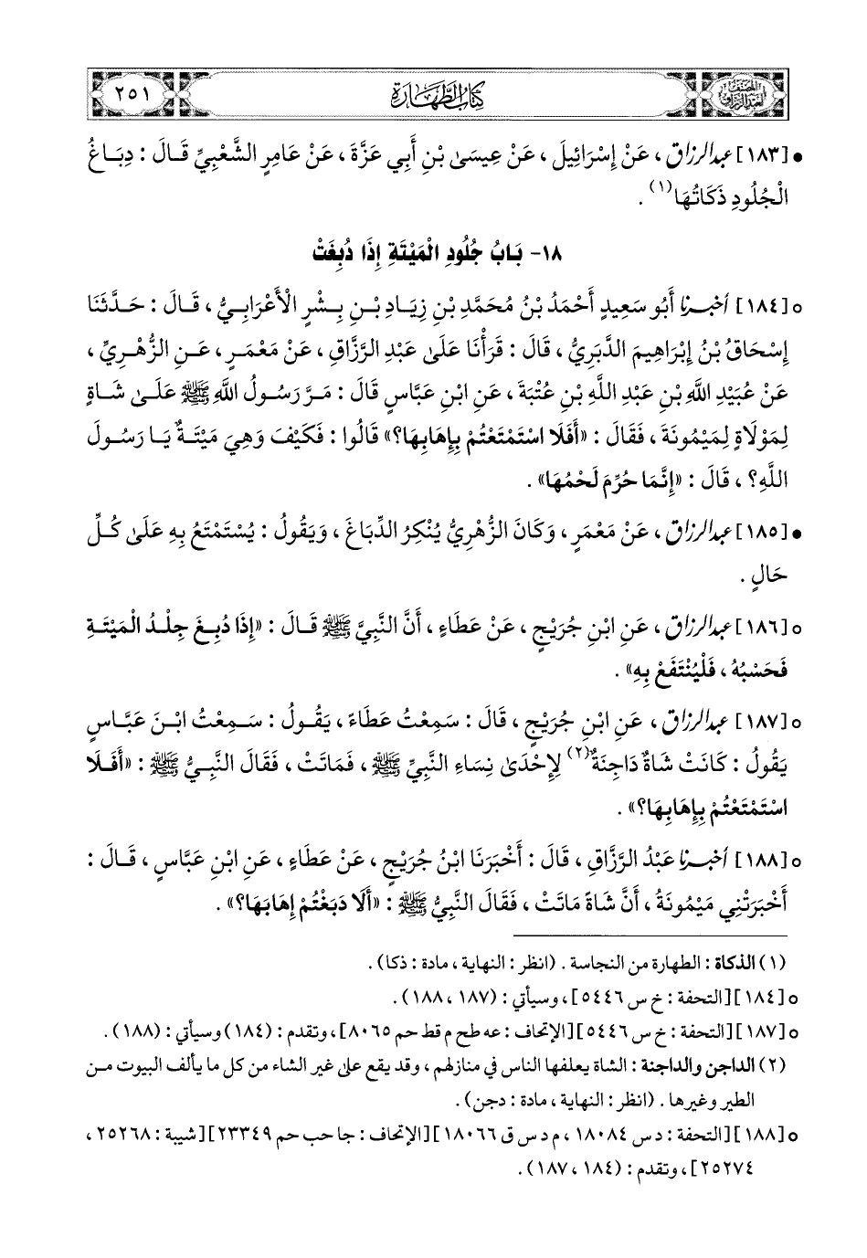 187- عبد الرزاق، عَنِ ابْنِ جُرَيْجٍ، قَالَ: سَمِعْتُ عَطَاءً يَقُولُ: سَمِعْتُ ابْنَ عَبَّاسٍ يَقُولُ: كَانَتْ شَاةٌ دَاجِنَةٌ لإِحْدَى نِسَاءِ النَّبِيِّ صَلَّى اللهُ عَلَيْهِ وَسَلَّمَ، فَمَاتَتْ، فَقَالَ النَّبِيُّ صَلَّى اللهُ عَلَيْهِ وَسَلَّمَ: أَفَلاَ اسْتَمْتَعْتُمْ بِإِهَابِهَا؟.