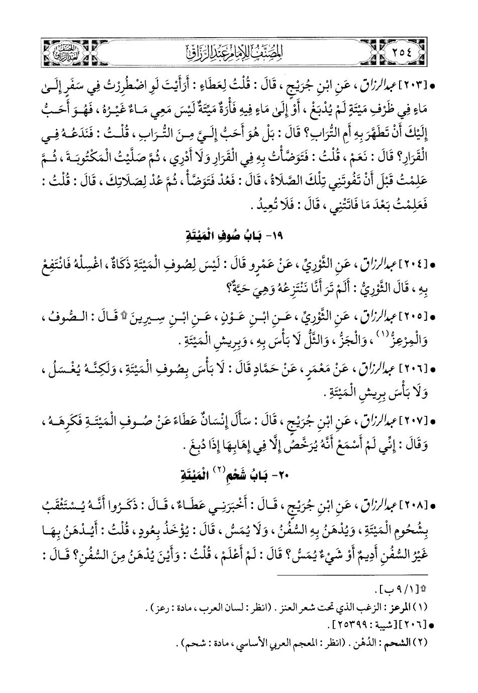 208- عبد الرزاق، عَنِ ابْنِ جُرَيْجٍ، قَالَ: أَخْبَرَنِي عَطَاءٌ، قَالَ: ذَكَرُوا أَنَّهُ يُسْتَثْقَبُ بِشُحُومِ المَيْتَةِ، وَيُدْهَنُ بِهِ السُّفُنُ، وَلاَ يُمَسُّ، قَالَ: يُؤْخَذُ بِعُودٍ، قُلْتُ: أَيُدْهَنُ بِهَا غَيْرُ السُّفُنِ أَدِيمٌ، أَوْ شَيْءٌ يُمَسُّ؟ قَالَ: لَمْ أَعْلَمْ، قُلْتُ: وَأَيْنَ يُدْهَنُ مِنَ السُّفُنِ؟ قَالَ: ظُهُورُهَا، وَلاَ يُدْهَنُ بُطُونُهَا، قُلْتُ: وَلاَ بُدَّ أَنْ يَمَسَّ وَدَكَهَا بِيَدِهِ فِي المِصْبَاحِ؟ قَالَ: فَلْيَغْسِلْ يَدَهُ إِذَا مَسَّهُ.
