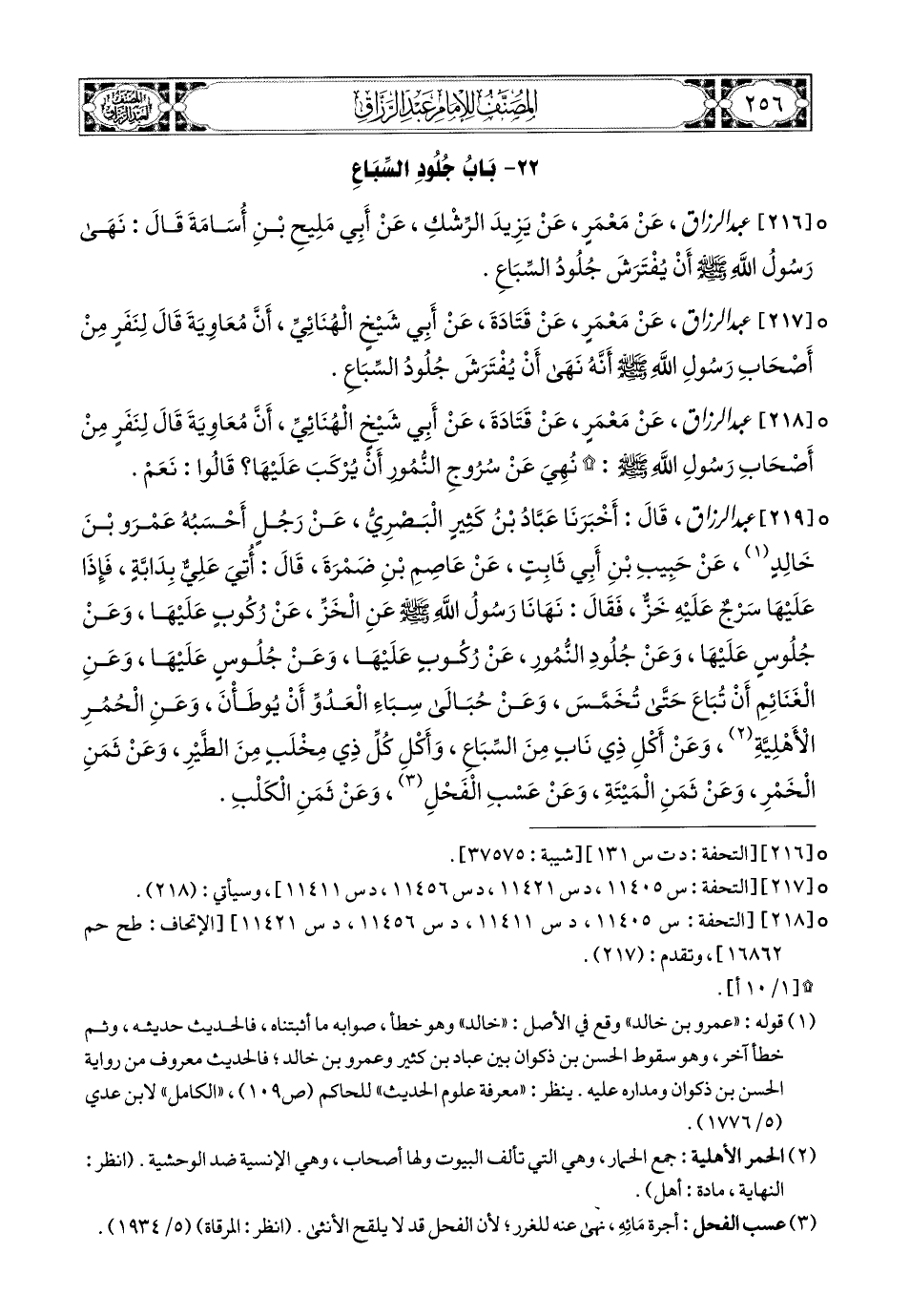 216- عبد الرزاق، عَنْ مَعْمَرٍ، عَن يَزِيدَ الرِّشْكِ، عَنْ أَبِي مَلِيحِ بْنِ أُسَامَةَ قَالَ: نَهَى رَسُولُ اللهِ صَلَّى اللهُ عَلَيْهِ وَسَلَّمَ أَنْ يُفْتَرَشَ جُلُودُ السِّبَاعِ.