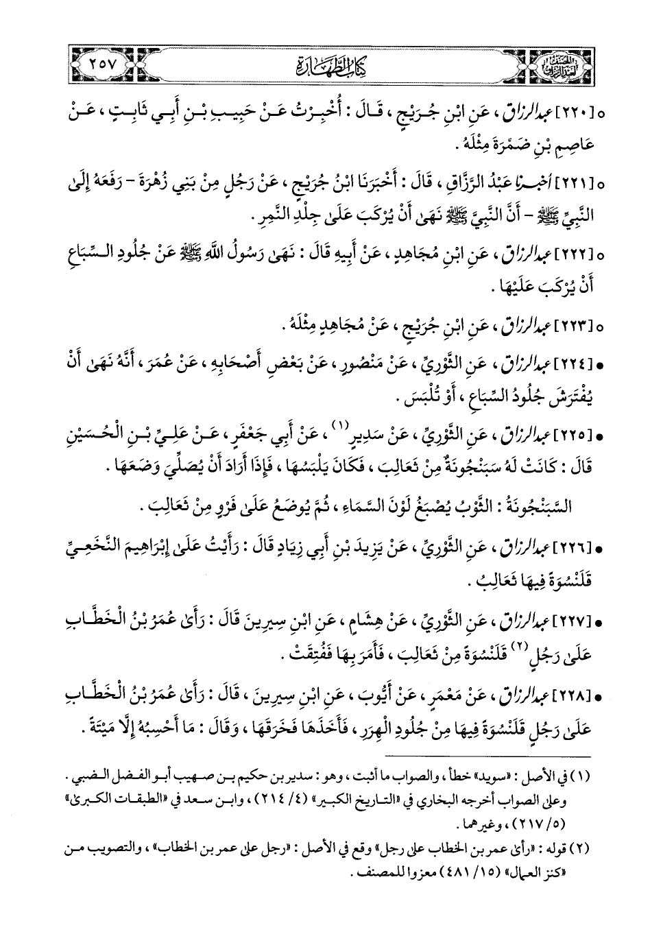 227- عبد الرزاق، عَنِ الثَّورِيِّ، عَن هِشَامٍ، عَنِ ابْنِ سِيرِينَ، قَالَ: رَأَى عُمَرُ بنُ الْخَطَّابِ عَلَى رَجُلٍ قَلَنْسُوَةً مِنْ ثَعَالِبَ، فَأَمَرَ بِهَا فَفُتِقَتْ.