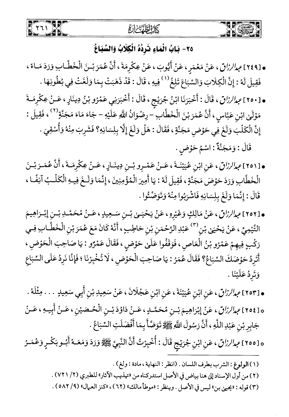 255- عبد الرزاق، عَنِ ابْنِ جُرَيْجٍ، قَالَ: أُخْبِرْتُ أَنَّ النَّبِيَّ صَلَّى اللهُ عَلَيْهِ وَسَلَّمَ وَرَدَ وَمَعَهُ أَبو بَكْرٍ، وَعُمَرُ عَلَى حَوْضٍ، فَخَرَجَ أَهْلُ المَاءِ، فَقَالُوا: يَا رَسُولَ اللهِ، إِنَّ الْكِلاَبَ وَالسِّبَاعَ تَلِغُ فِي هَذَا الْحَوْضِ، فَقَالَ: لَهَا مَا حَمَلَتْ فِي بُطُونِهَا، وَلَنَا مَا بَقِيَ شَرَابٌ وَطَهُورٌ، شَكَّ الَّذِي أَخْبَرَنِي أَنَّهُ حَوْضُ الأَبْوَاءِ.
