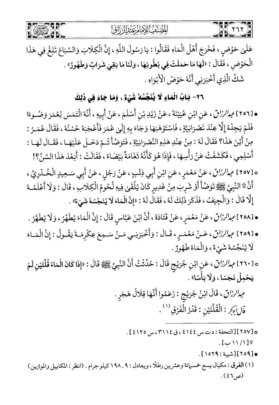 260- عبد الرزاق، عَنِ ابْنِ جُرَيْجٍ، قَالَ: حُدِّثْتُ أَنَّ النَّبِيَّ صَلَّى اللهُ عَلَيْهِ وَسَلَّمَ قَالَ: إِذَا كَانَ المَاءُ قُلَّتَيْنِ، لَمْ يَحْمِلْ نَجِسًا، وَلاَ بَأْسًا.